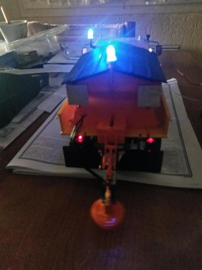 Le camion de marque MERCEDES a été construit avec la maquette de chez REVELL. Pour le rendre plus réaliste, nous avons éclairé les phares avant et arrière et installé des gyrophares bleus. La neige a été représentée par de la ouate. Le système d’entrainement est constitué de deux pignons avec une chainette, des interrupteurs fin de course ont été installés pour permettre la marche arrière du véhicule.